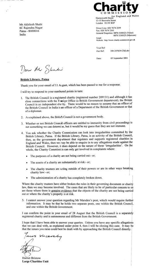 The letter of Harriet Bristow, an Official of Charity Commission, has confirmed that British Council is a separately registered Charity and is Autonomous.Charity has been defined as an organization whose aims are for exclusively charitable purposes and providing clear benefits to others in the society.The council is financed partly by a grant from Foreign And Commonwealth Office(FCO).