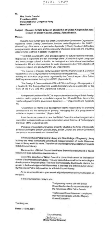 It is clear that British Council is a charity organization committed to disseminate up-to-date information about Science & Technology to the very fringe of civilized society which Patna , Ranchi and Lucknow are.