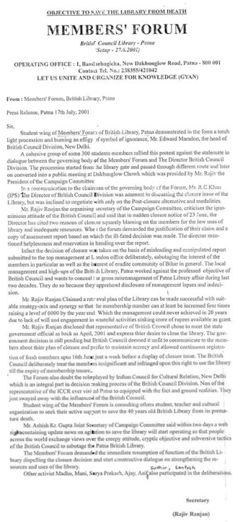 Everything was smooth and dandy until July 2001. The membership was continuously rising. All the tables used to be filled up with readers. Any English Learning Programme was well attended. The only short coming was that not as many students from Patna area were making a beeline for UK Universities.